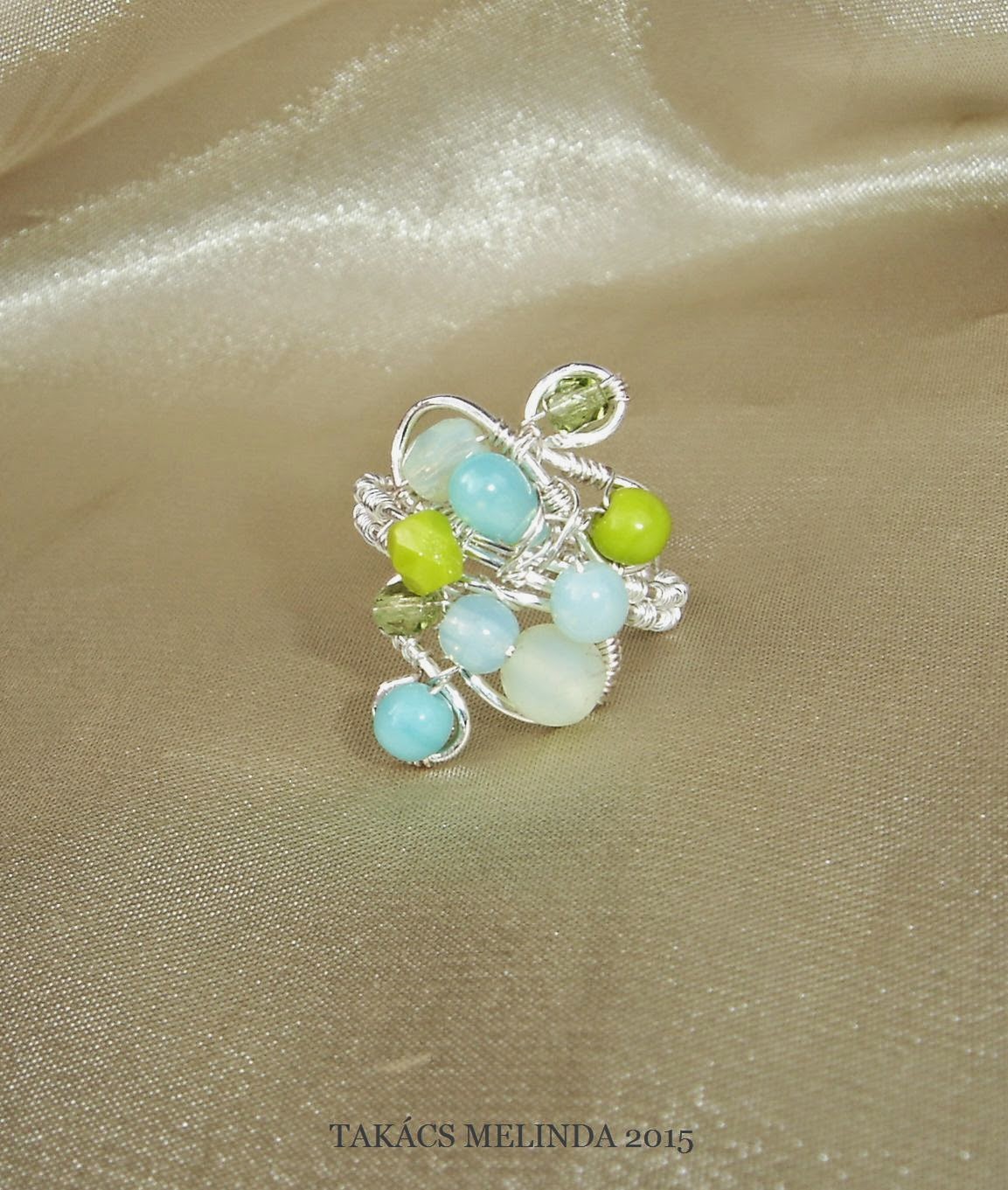 Silvered wire wrapped earrings and ring with light blue and green czech glass bead